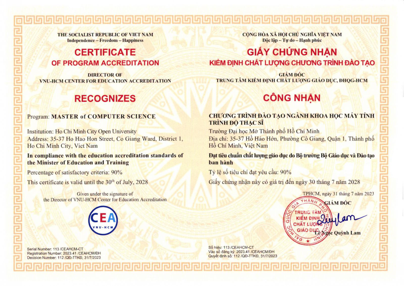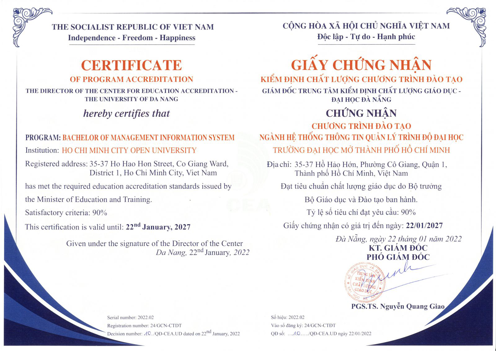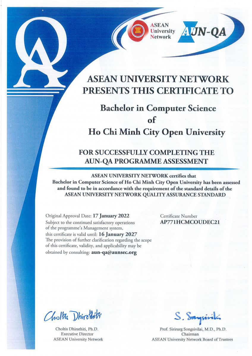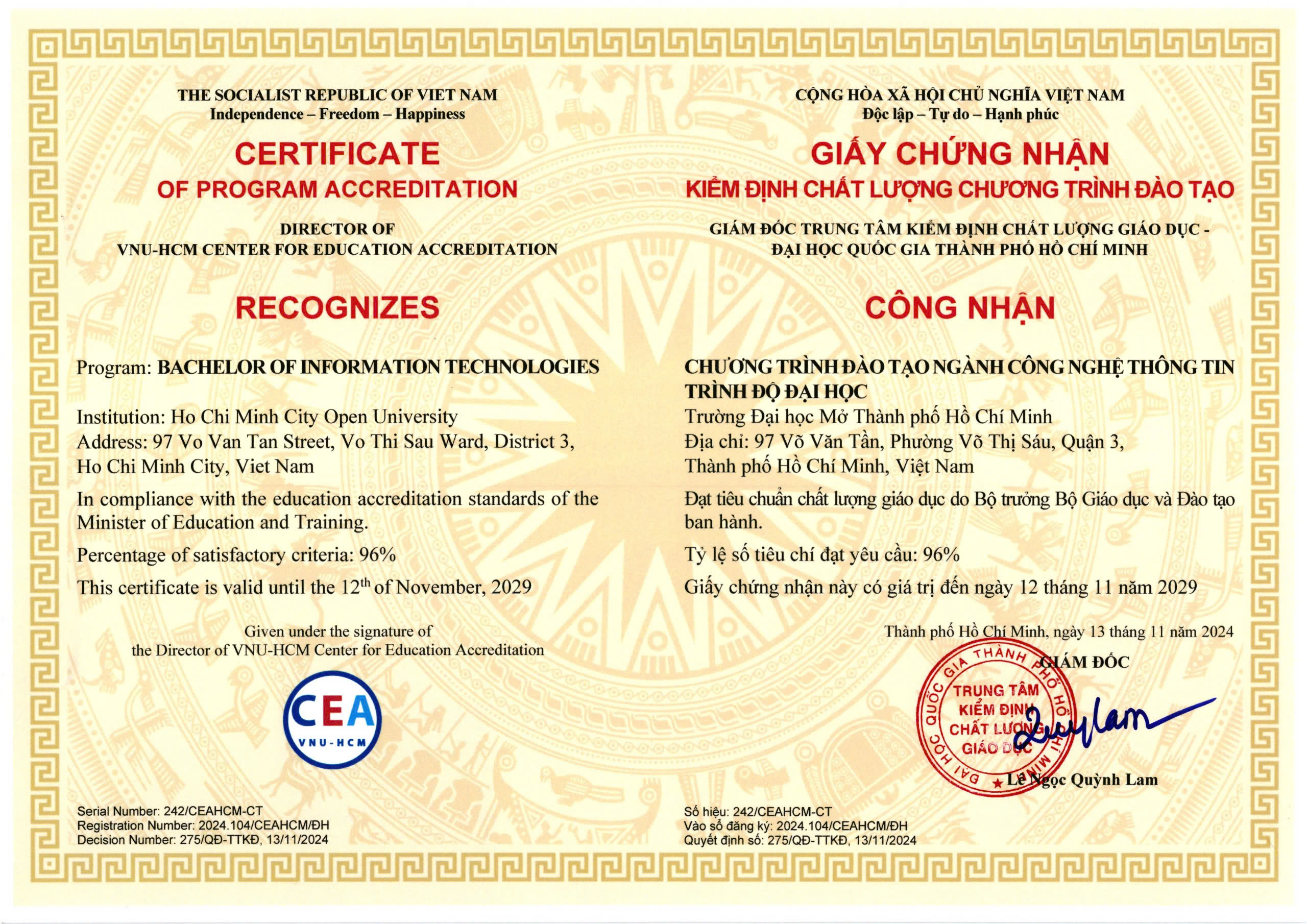 In 2021 & 2022, the Management Information Systems program was accredited by the Vietnam Ministry of Education and Training (MOET), and the Computer Science program received accreditation from the ASEAN University Network (AUN). In 2024, the Faculty completed the accreditation process for its Information Technology program according to MOET standards.